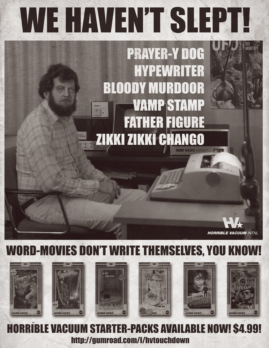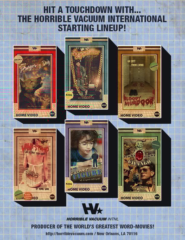 Get all 6 titles from the Horrible Vacuum starting lineup for the price of only 5 of them! That's an entire feature-length word-movie in both .mobi and .epub formats along with some high-rez cover art for your neat home printer for practically for free! You'd have to think we were morons to score this sports play! Act now while unlimited supplies last! Wow!